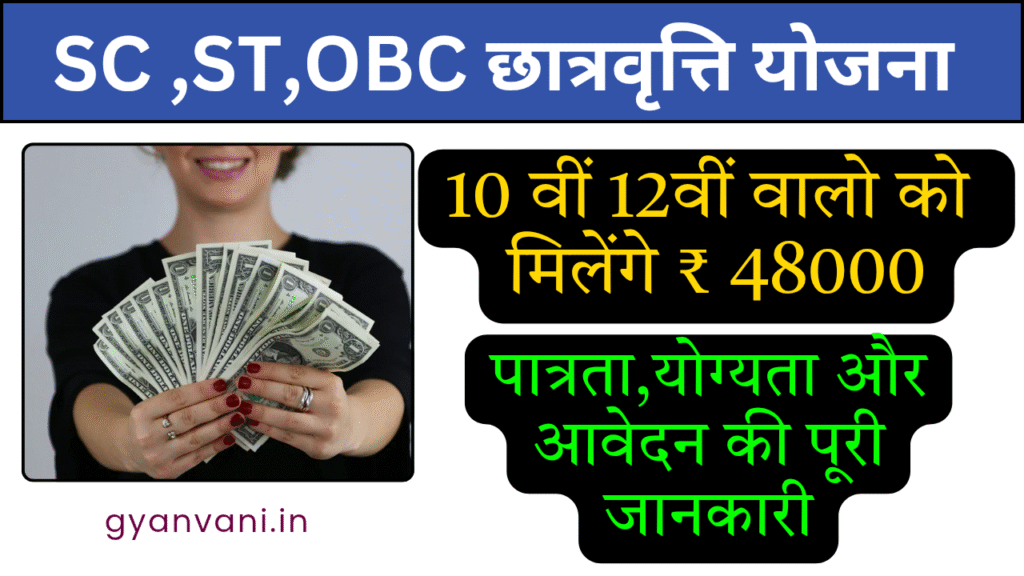 SC, ST और OBC छात्रों के लिए छात्रवृत्ति योजना 2025: पात्रता, लाभ और ऑनलाइन आवेदन प्रक्रिया   SC, ST, OBC छात्रवृत्ति योजना 2025 एक सरकारी योजना है, जिसके तहत आर्थिक रूप से कमजोर अनुसूचित जाति (SC), अनुसूचित जनजाति (ST) और अन्य पिछड़ा वर्ग (OBC) के छात्रों को उच्च शिक्षा के लिए हर साल 48,000 रुपये